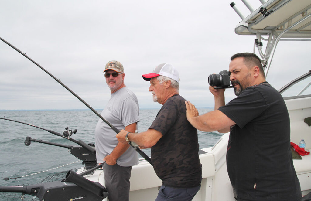 Normalement les groupes sont de 4 pêcheurs et la capture des poissons se fait en alternance (chacun son tour). Toutefois il est possible d’embarquer jusqu’à 6 pêcheurs à la fois. Les limites de prises sont de 5 salmonidés par personne avec un maximum de 2 truites arc-en-ciel (steelhead). Même si les prises les plus fréquentes au lac Ontario sont les saumons chinooks et cohos et la steelhead, il est aussi possible de capturer de la truite brune, du touladi et du saumon de l’Atlantique. Ah oui j’oubliais. Au lac Ontario on a le droit d’utiliser 2 cannes par pêcheur. Donc, pour un groupe de 4 plus le capitaine, il est possible d’utiliser 10 cannes, ce qui augmente bien sûr les chances de croiser le fer avec plusieurs salmonidés.