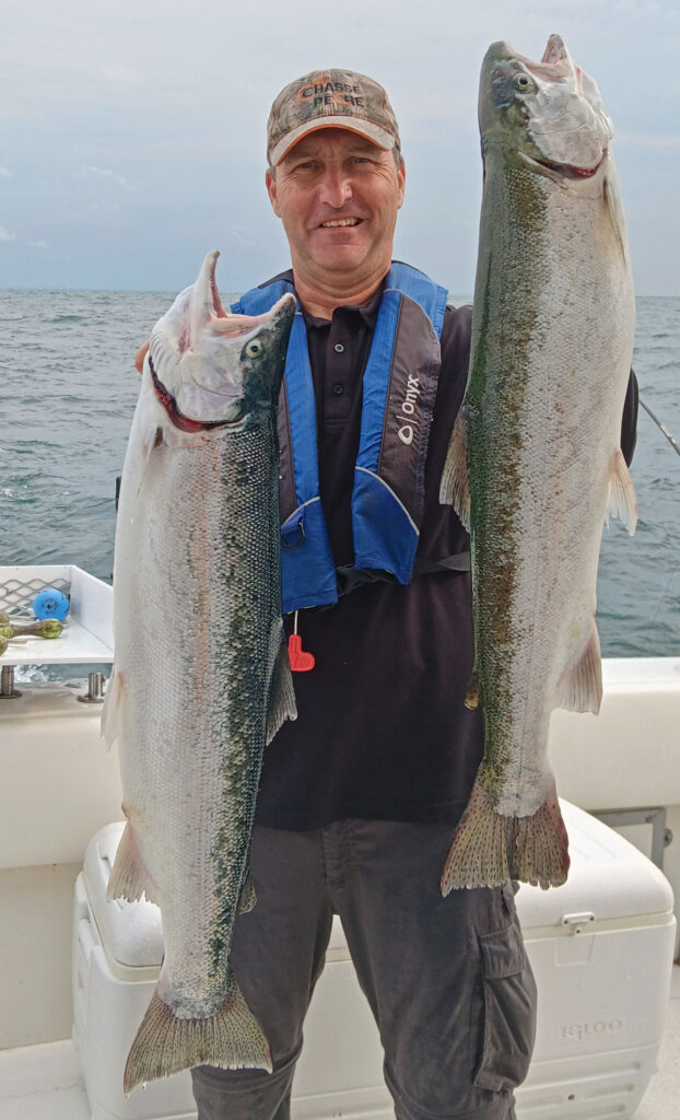 L’auteur posant fièrement avec ses deux grosses truites arc-en-ciel (steelhead) leurrées lors de sa sortie de pêche au Lac Ontario.