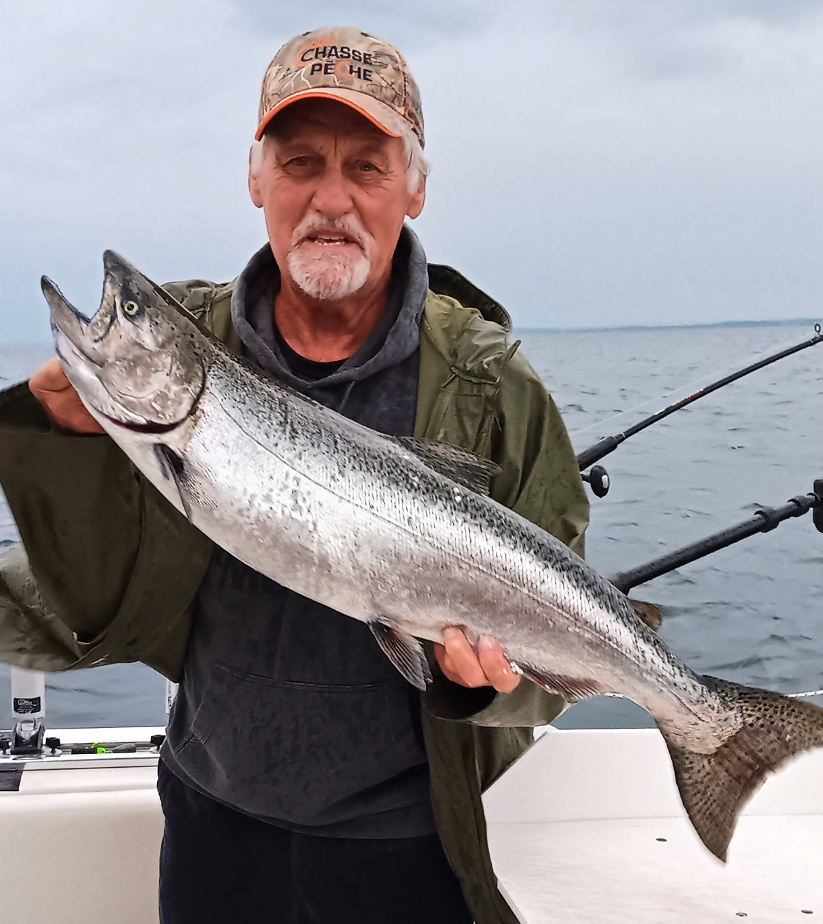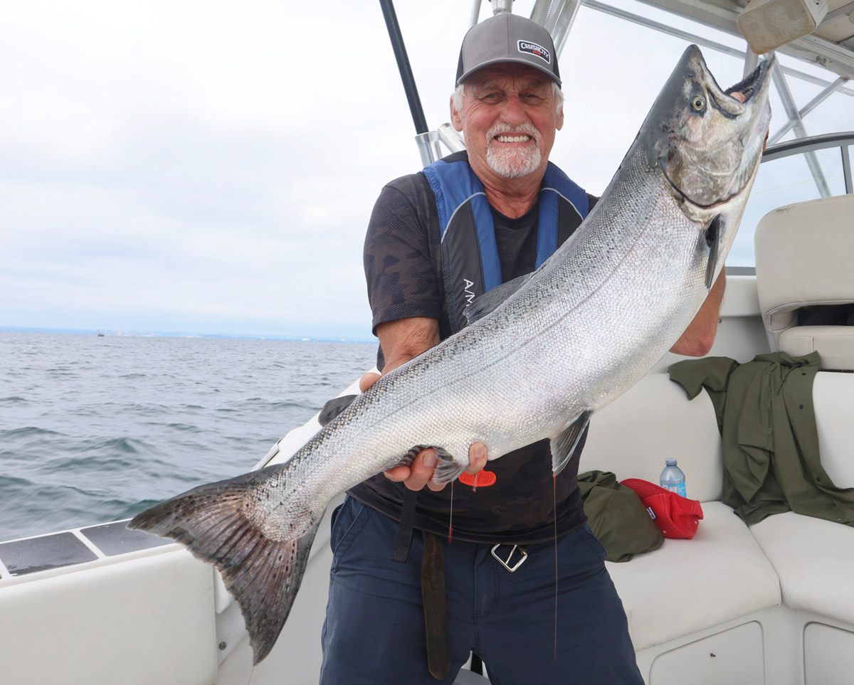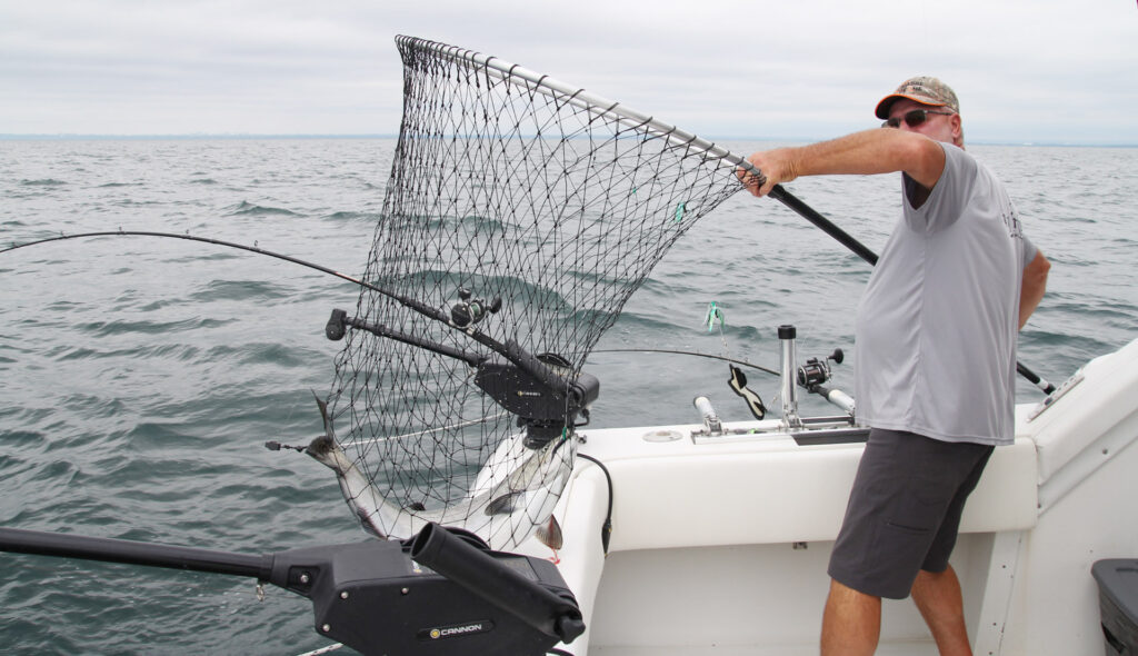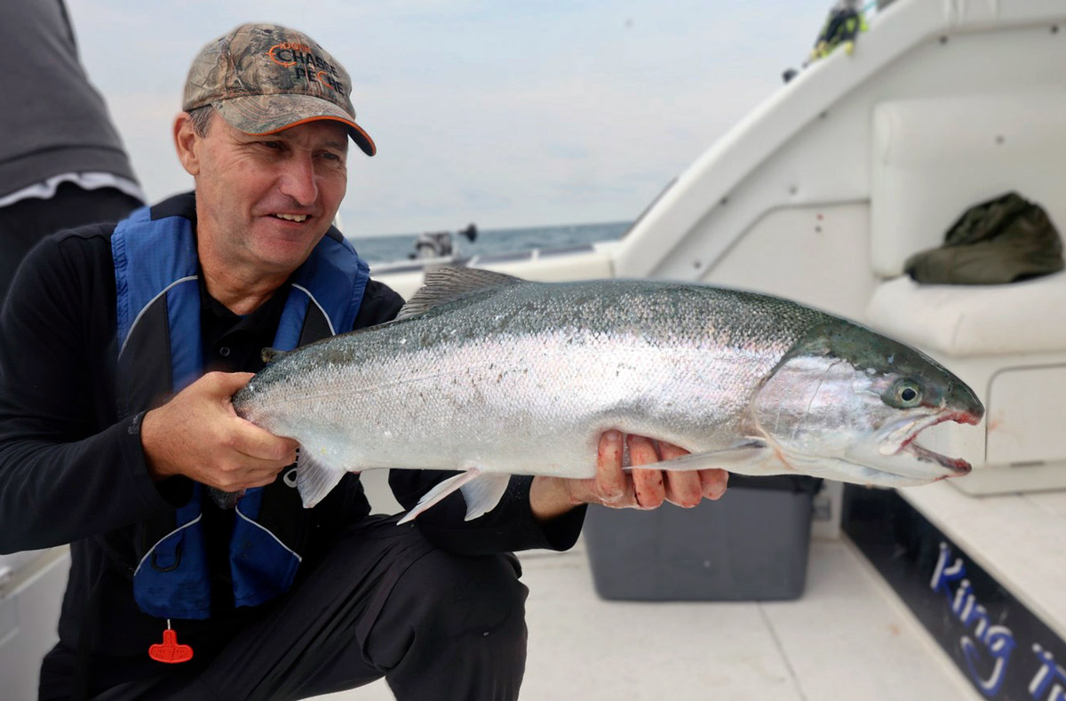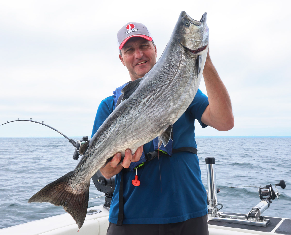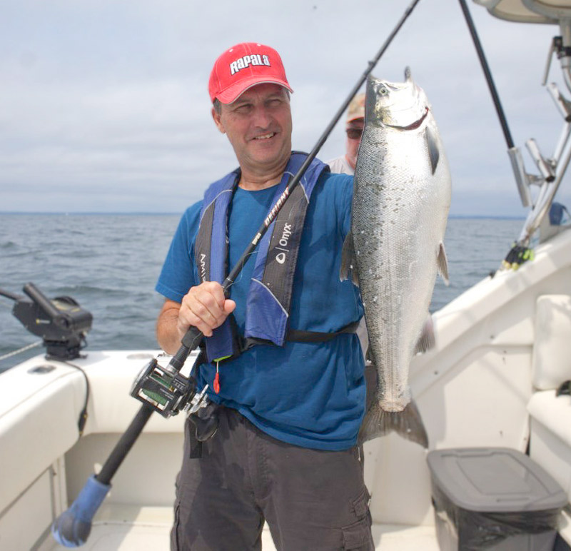 Le guide Luc Ledoux venant de puiser un beau saumon du lac Ontario. Le forfait comprend d’ailleurs tous les équipements utiles pour la pêche.