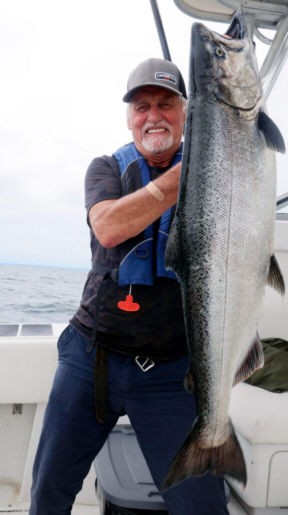 Le père de l’auteur avec la plus grosse prise de la journée. Un gros saumon chinook bien dodu et ultra combatif.