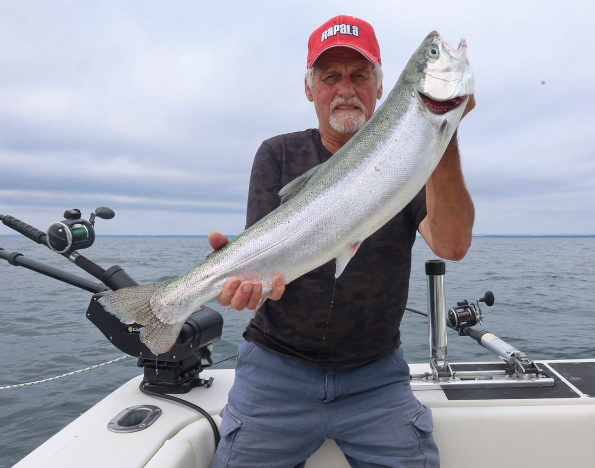 Fish on! Lance notre guide et propriétaire de KING TRACKER SPORT FISHING,  Luc Ledoux. Comme c’est mon tour, je saute sur la canne qui repose dans le support du downrigger et qui gigote sous les soubresauts d’une belle prise. J’ai droit à un superbe combat de la part d’un poisson spectaculaire qui ne se gêne pas pour sortir de l’eau. Luc me dit aussitôt qu’il s’agit d’une truite steelhead ou si vous préférez d’une grosse arc-en-ciel, car, en fait, il s’agit bien de la même espèce (Oncorhynchus mykiss). Wow! Je n’en reviens pas de la taille de la truite et du combat qu’elle me livre. Lorsque Luc passe enfin le bolide argenté dans le filet, je suis vraiment content et excité, car il s’agit définitivement de ma plus grosse arc-en-ciel à vie. Mon ami et collaborateur au magazine François Lévesque, qui est là pour filmer notre pêche, n’a rien manqué du combat. Vous pouvez d’ailleurs voir le résultat de ses excellentes prises de vue et de son remarquable travail de montage à la fin de l’article.